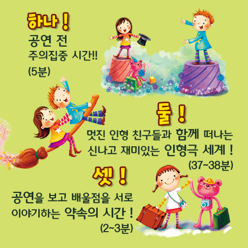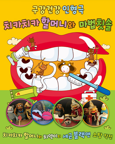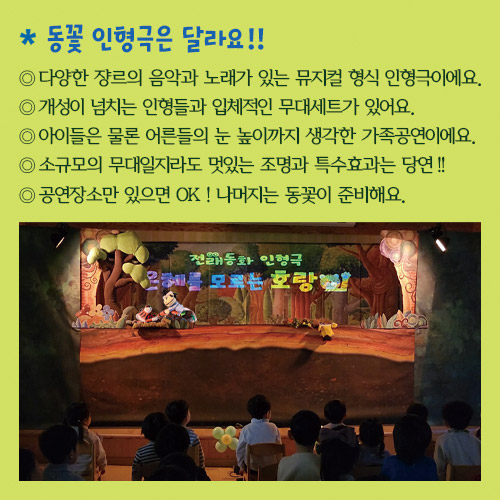 인형극 - 인형극리스트 · 공연구성 · 무대 - 인형극 똥장군 구리 - 혹부리영감과 노래주머니 - 도치의 모험 - 은혜를 모르는 호랑이 - 치카치카할머니와 마법칫솔 - 색깔나라의 여행 - 인형극 아빠의 반딧불이 - 왕치와 소새와 개미 - 인형극 떴다! 빵구차! - 크리스마스 선물 ⊙ 인형극 공연 리스트 - 모든 작품 상시 공연 가능 건강한생활.자신감.용기.우정 전래동화.욕심없이나누는기쁨.권선징악 가족애.우정.용기.지혜 전래.약속의소중함.지혜 구강보건.안전.건강.협동 장애이해.환경.사랑.우정.건강 흡연예방.절주.환경.가족애 친구간우정.부지런한생활 실종.유괴예방.안전교육 사랑과우정.자아성찰 ⊙ 인형극 프로그램 구성 ⊙ 인형극 무대(실내) ⊙ 인형극 무대(야외) 인형극 인형극리스트 · 공연구성 · 무대 인형극 똥장군 구리 혹부리영감과 노래주머니 도치의 모험 은혜를 모르는 호랑이 치카치카할머니와 마법칫솔 색깔나라의 여행 인형극 아빠의 반딧불이 왕치와 소새와 개미 인형극 떴다! 빵구차! 크리스마스 선물