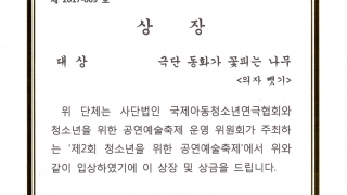 2017년 루마니아 FEST(IN) on the Boulevard International Theater Festival 심사위원 특별상 수상 2017년 10월 12일부터 17일까지 유럽 루마니아 국제연극축제에 참가! 13일 공연에서 우수한 성과를 이루어 냈습니다. 현지 루마니아 스태프와 축제 관계자 분...