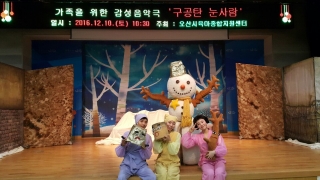 일시 : 2016년 12월 10일 토요일 오전 10시 30분 장소 : 오산시청 대강당 제목 : 구공탄눈사람 주최 : 오산시육아종합지원센터 대상 및 관람인원 : 오산시 가족 300여명