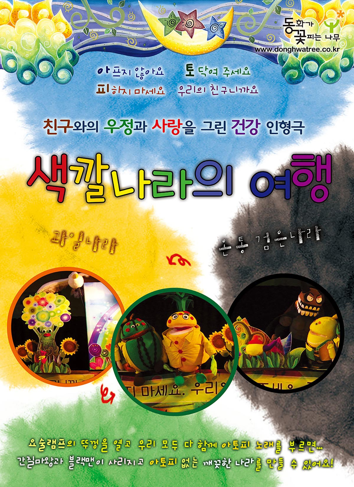 신비의 새가 알려준 노래 [아프지 않아요. 토닥여 주세요. 피하지 마세요. 우리의 친구니까요.] 를 다 같이 힘차게 불러서 블랙맨을 물리치고 아토피 피부염이 없는 깨끗한 과일나라를 함께 만들고 주위에 자기보다 약하거나 힘들어 하는 친구가 있다면 사랑과 우정으로 안아 줄 수 있는 멋진 친구가 되어보아요.